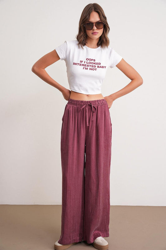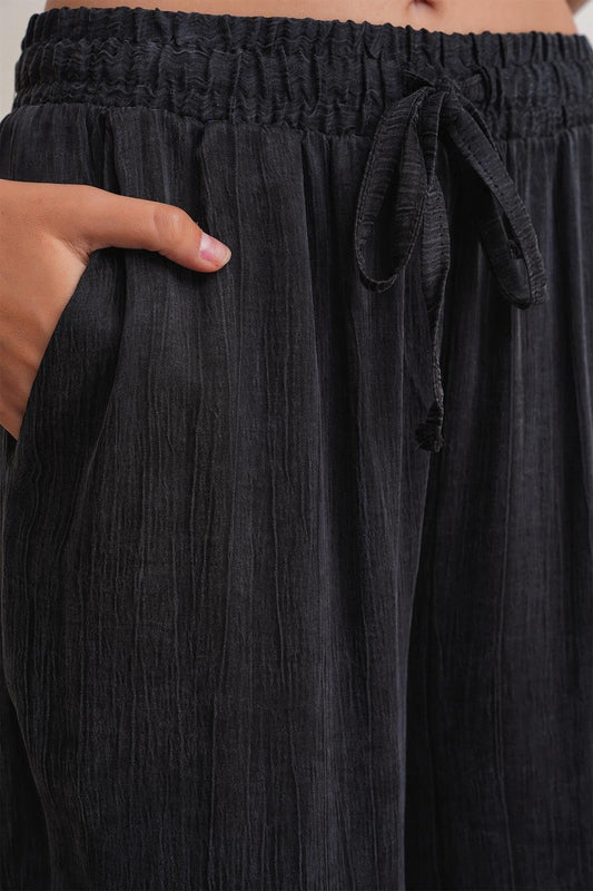 KADIN PANTOLON BELİ LASTİKLİ BOL PAÇA WİDE LİGE ESKİTME KETEN