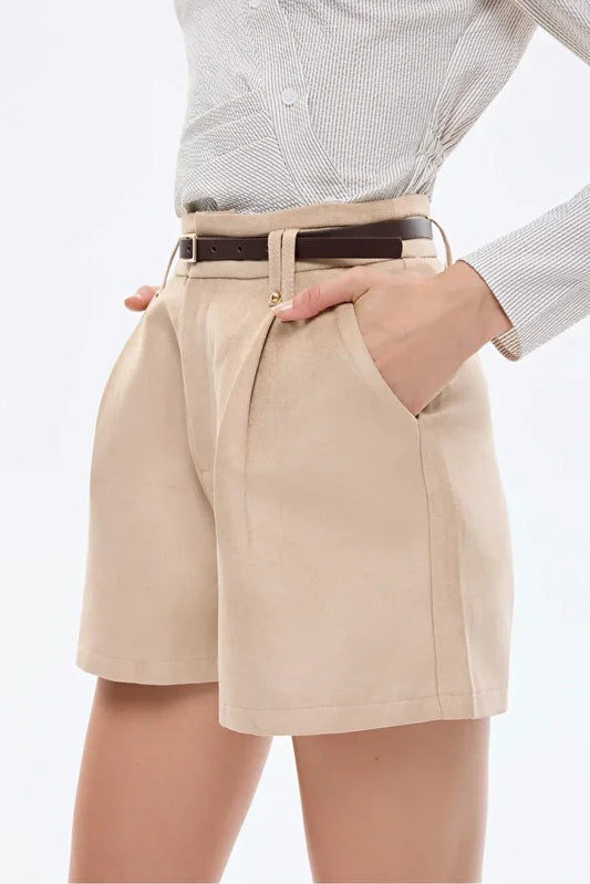 Süet Görünümlü Kemer Aksesuarlı Mini Şort Bej