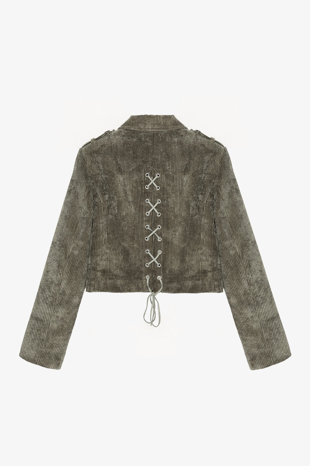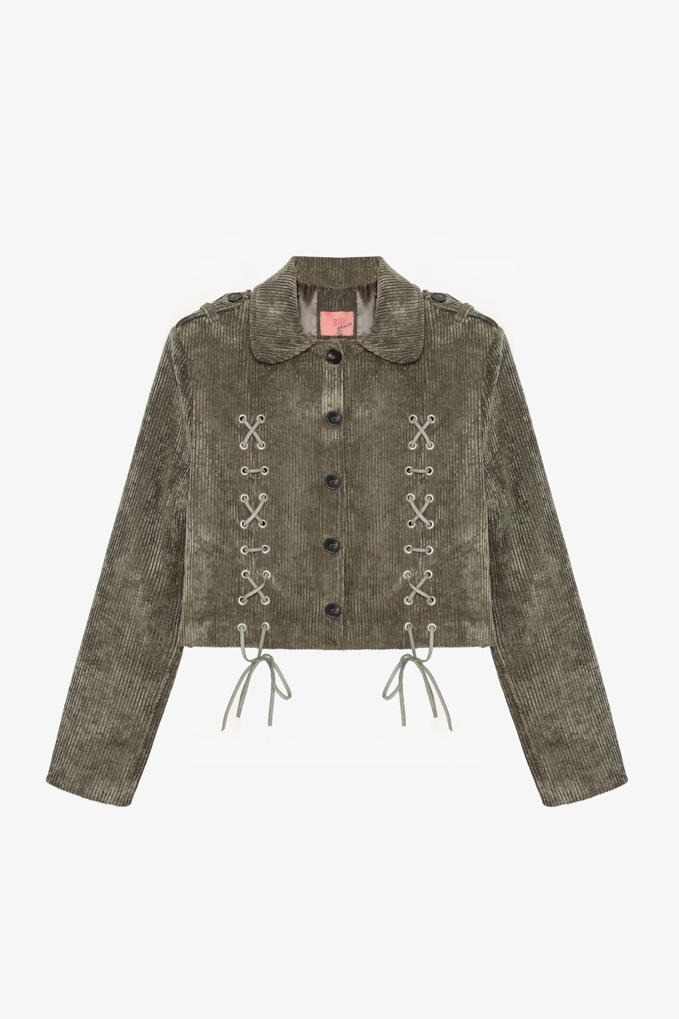 Bağcıklı Kadife Fitilli Crop Ceket Haki