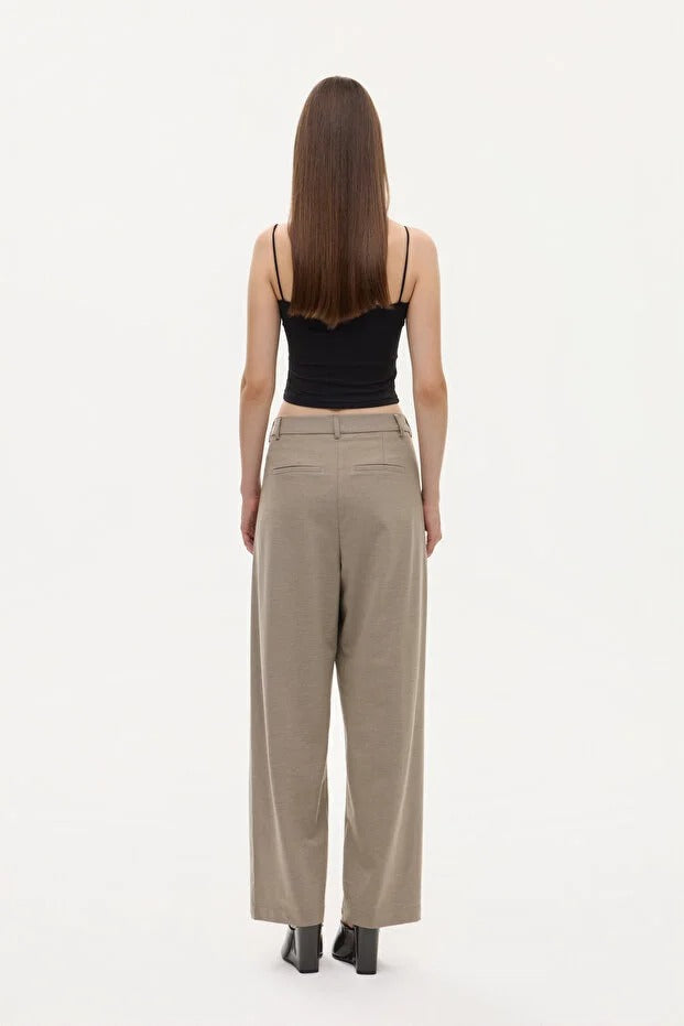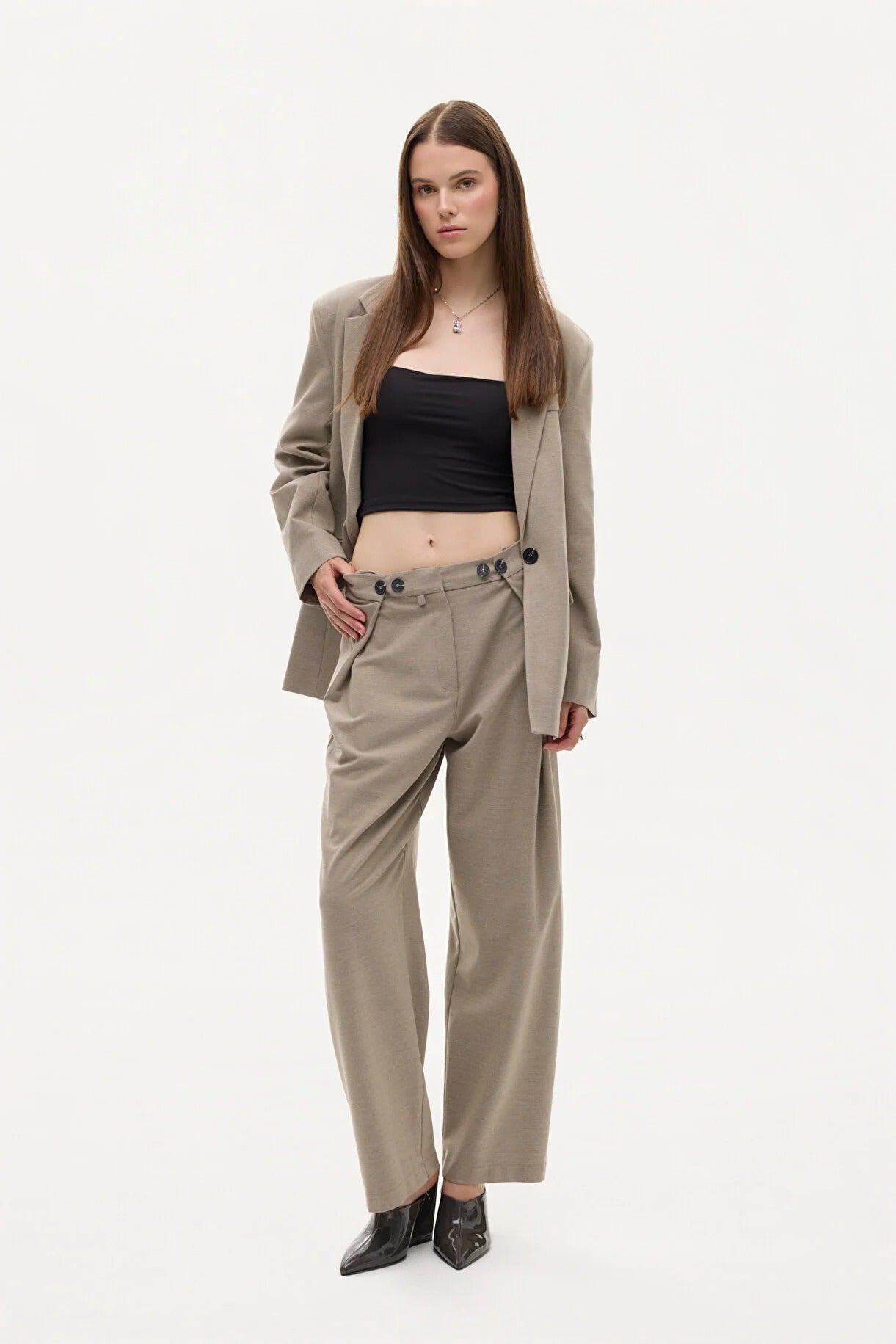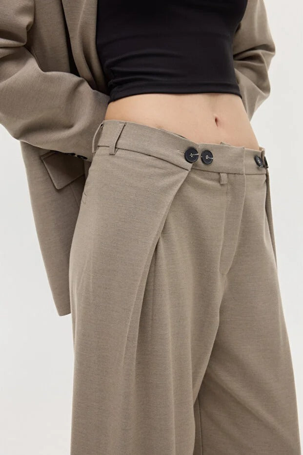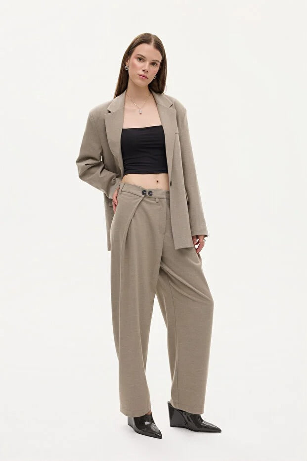Düğme Detaylı Pileli Yüksek Bel Kumaş Pantolon Vizon