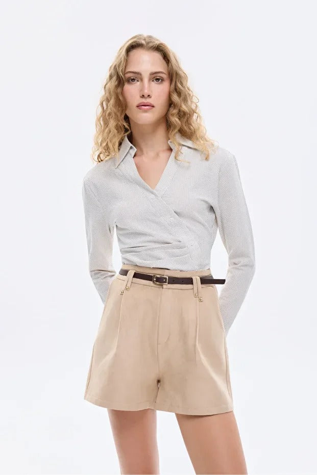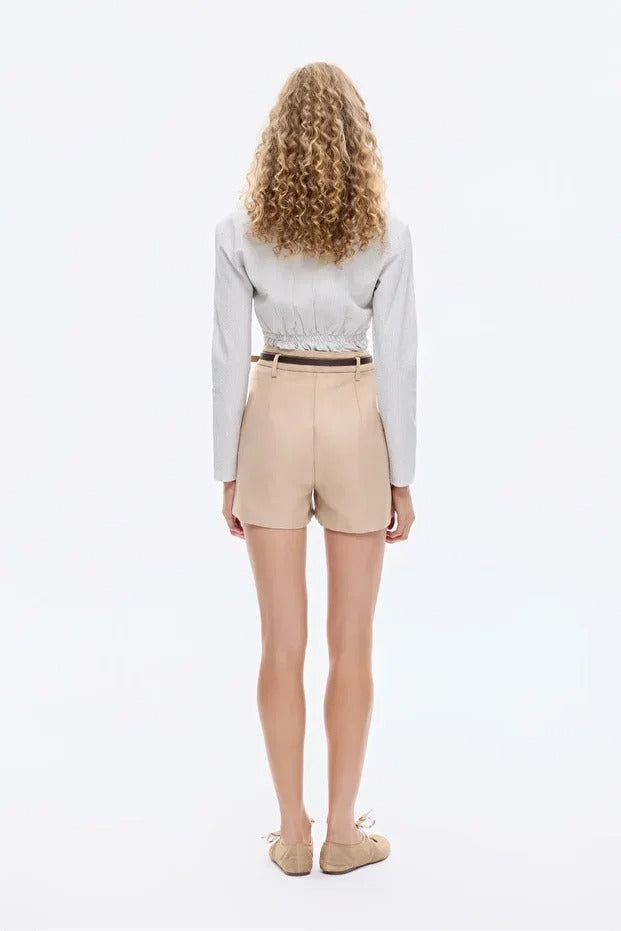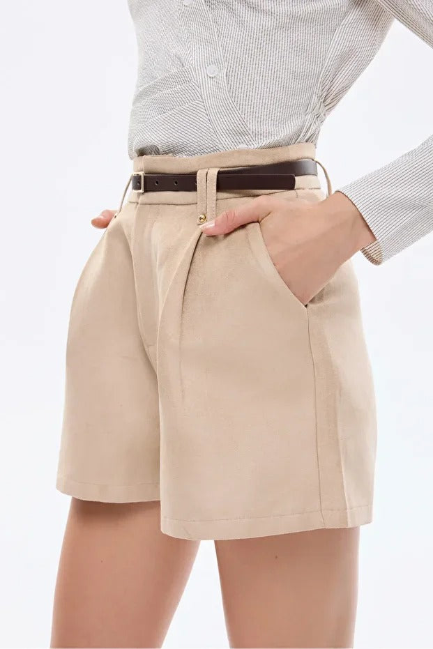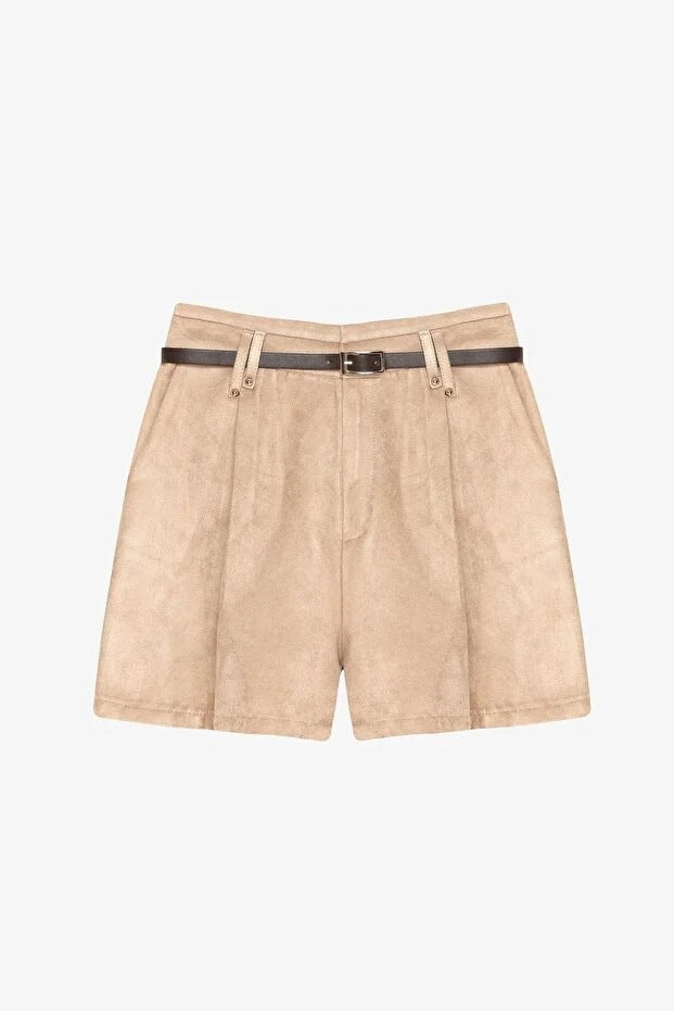 Süet Görünümlü Kemer Aksesuarlı Mini Şort Bej